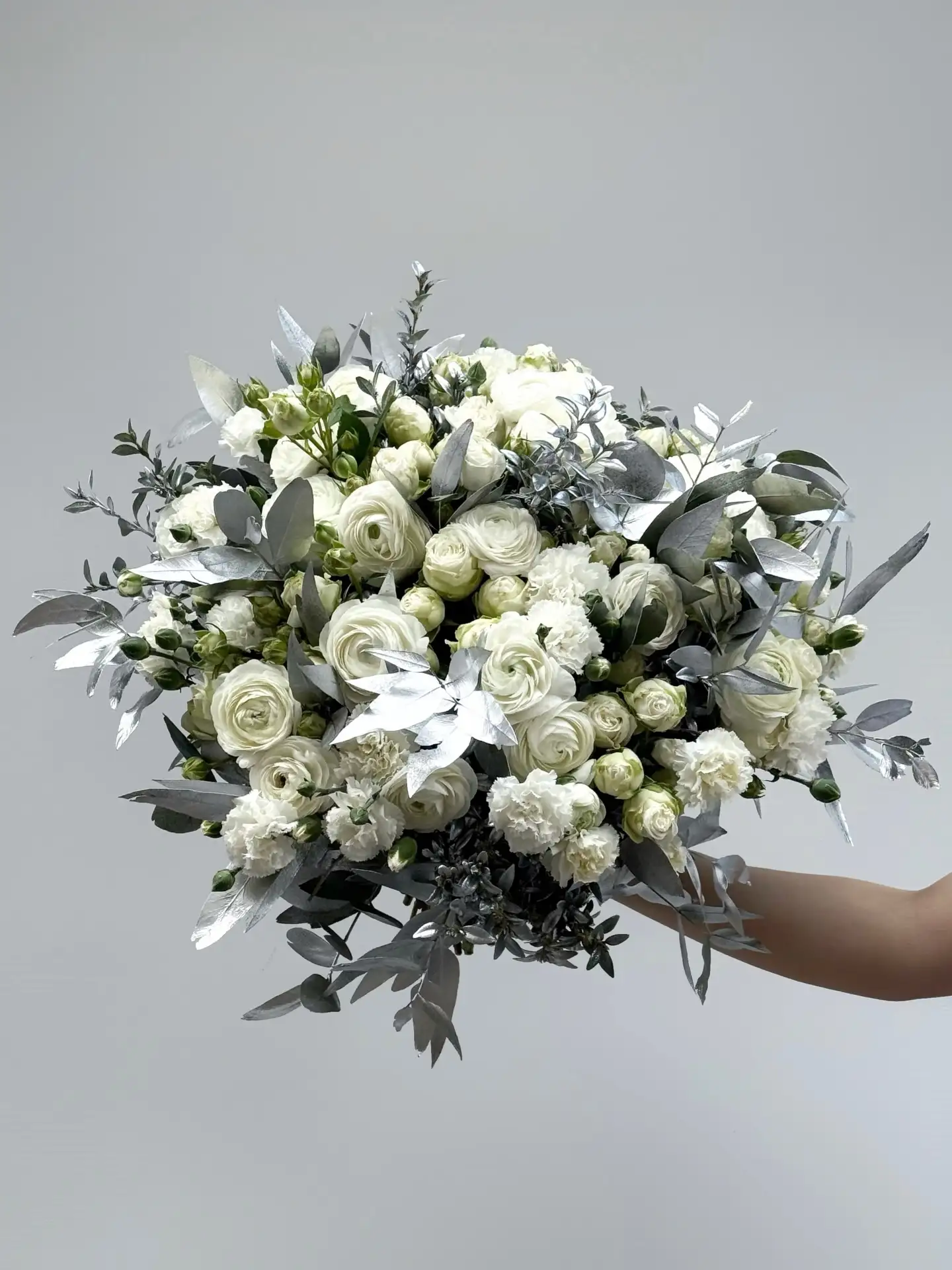 - Воздух и текстура: Самый недооцененный, но важный элемент это зелень и мелкие соцветия. Эвкалипт, веточки фисташки или нежная гипсофила придают букету ту самую «живость» и природную небрежность, которая сейчас на пике моды.